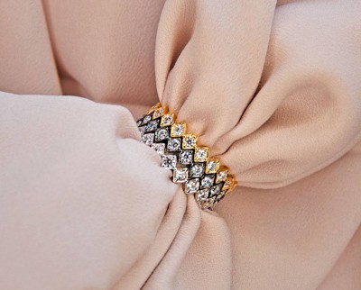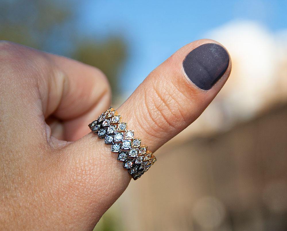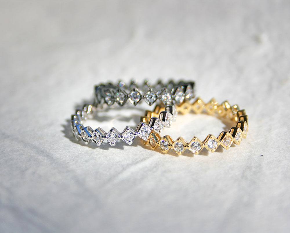 Destaca por llevar lo largo de todo el anillo circonitas incrustadas en forma de rombo.