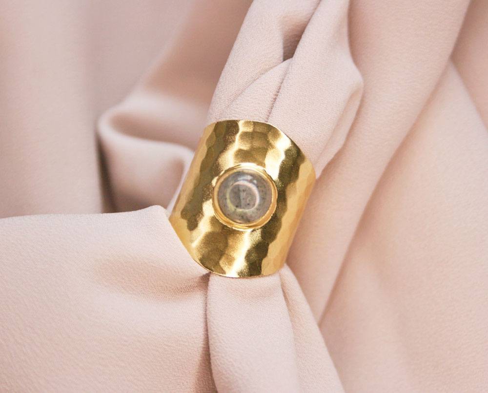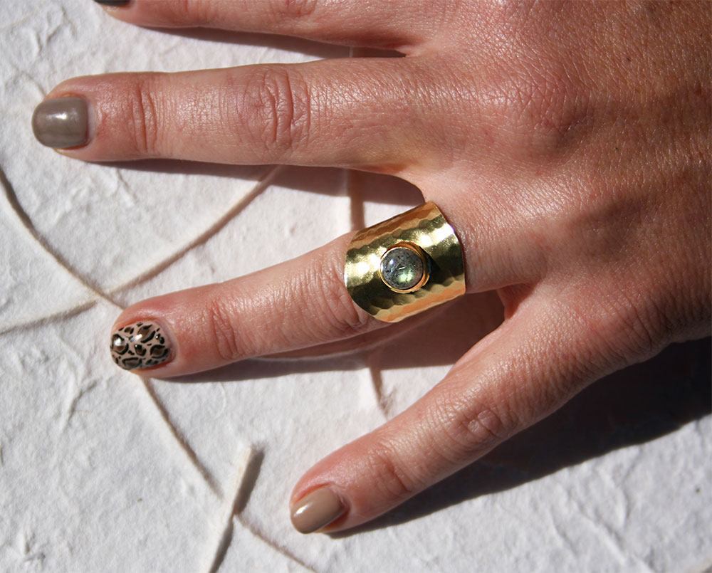 Es un anillo de caña de 20mm, hecho en plata de 1ª Ley 925 y una piedra mineral de 8mm en el centro.