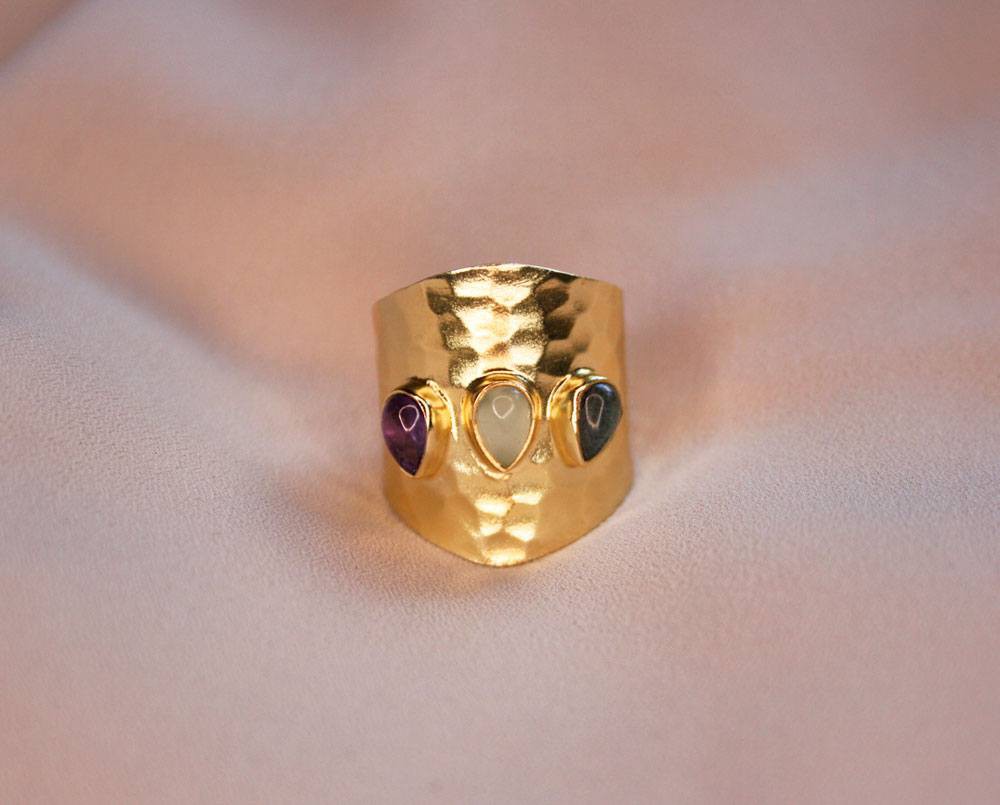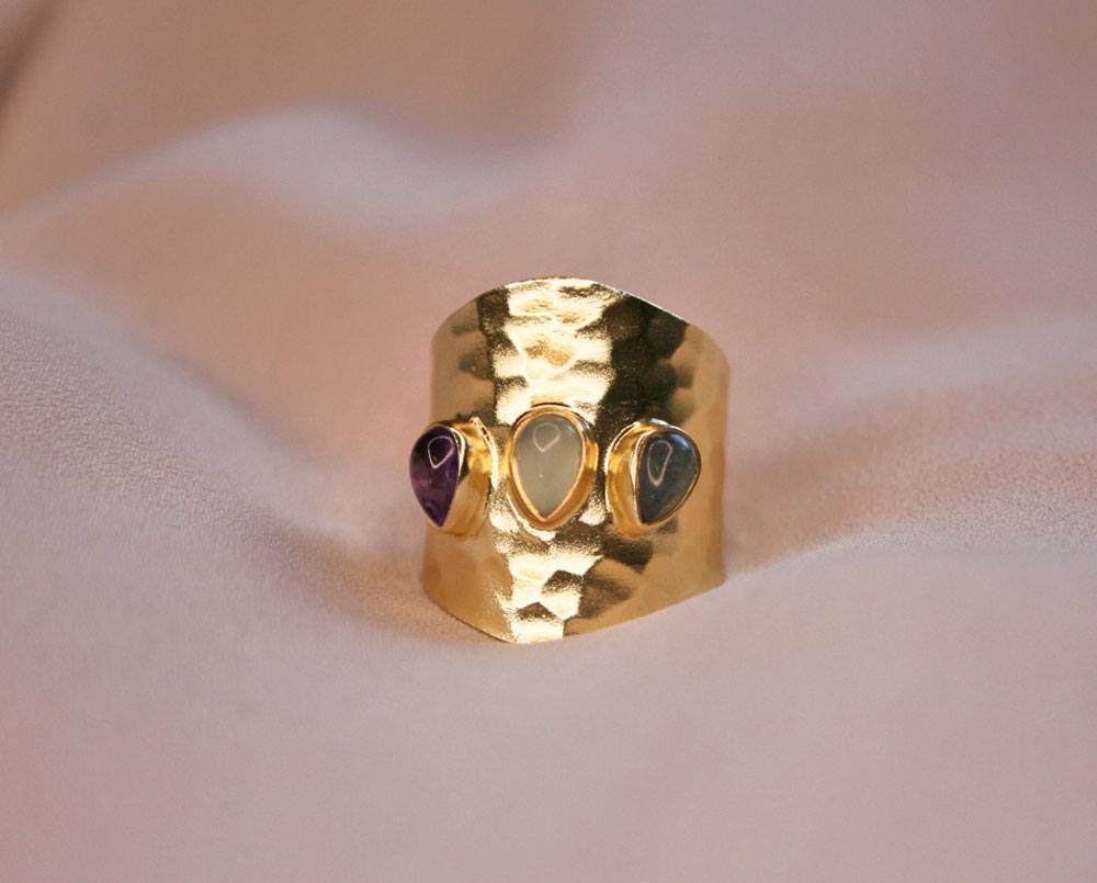 Es un anillo de caña de 20mm, hecho en plata de 1ª Ley 925 y 3 piedras minerales en forma de lágrima.