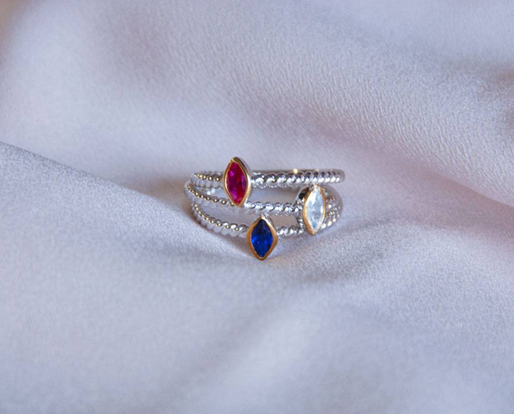 El anillo Yalitza es una joya única que puedes personalizar escogiendo el color de la circonita central.