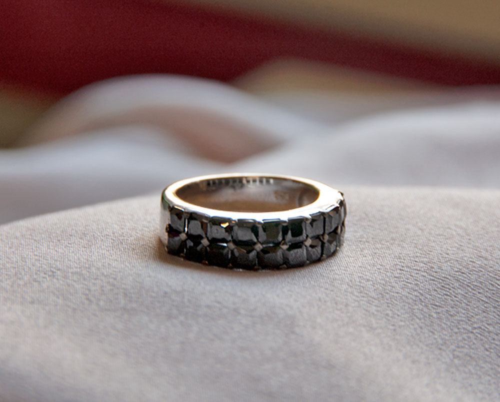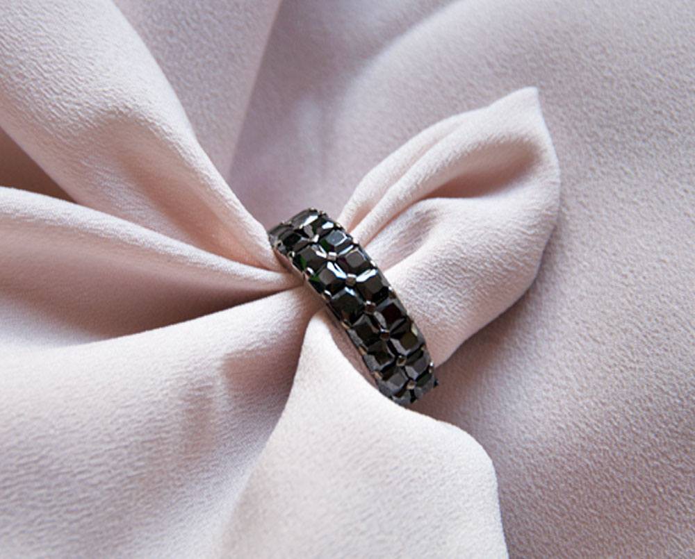 El anillo Kinari es una sortija muy llamativa. Es un anillo semiancho con 2 tiras de circonitas cuadradas en la parte superior
