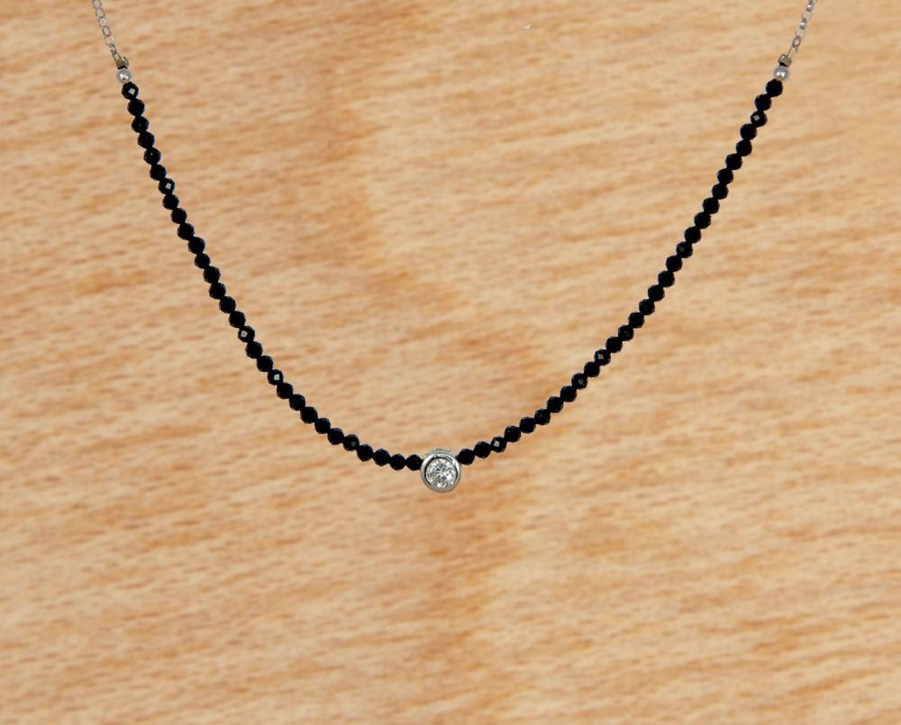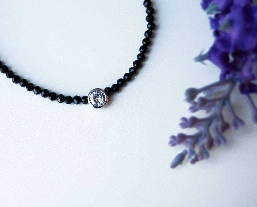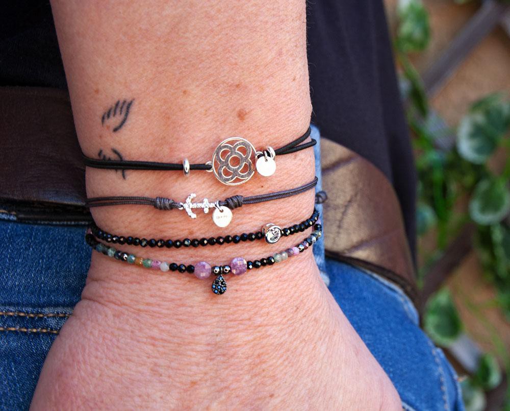 La pulsera Aliza combina piedras minerales onix, bolitas de plata de 1ª Ley y una circonita central con bisel de plata.